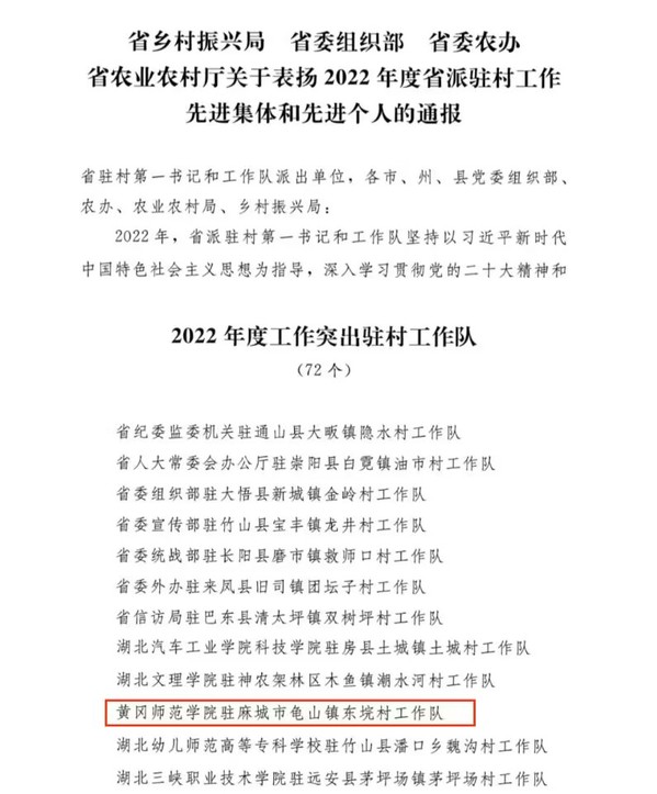 本网讯 近日,《关于表扬2022年度省派驻村工作先进集体和先进个人的通报》(鄂乡振文【2023】19号)发布,我校驻麻城市龟山镇东垸村乡村振兴工作队被省委组织部、省委农办、省农业农村厅和省乡村振兴局评为“2022年度工作突出驻村工作队”。