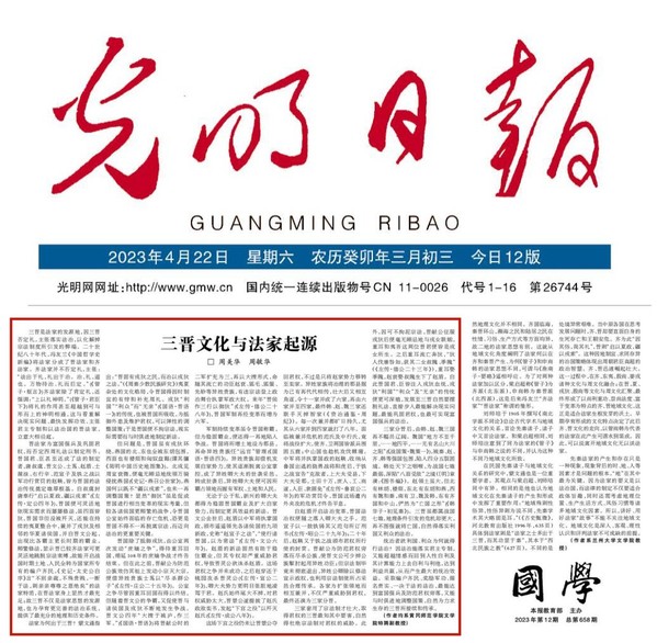 4月22日,《光明日报》第11版(国学版)刊发了我校文学院特聘副教授周美华、周敏华题为《三晋文化与法家起源》的理论文章。文章从三晋的地理位置、军制改革、政体改革等方面精辟地阐述了法家起源于三晋的原因,为我们了解和研究三晋文化和法家的关系提供了重要参考。