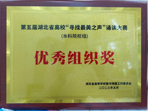 本网讯 5月19日,“青春之声越百年”暨第五届湖北省高校“寻找最美之声”诵读大赛决赛在武汉大学图书馆举行。我校学子谢晓岩荣获大赛三等奖,谢晓岩朗诵的作品《祖国到底是什么(节选)》、武清阳与杨恩发朗诵的作品《红烛》、张梓庚朗诵的作品《相信未来》荣获“网络人气作品奖”。我校图书馆荣获“优秀组织奖”,图书馆张巧珍老师荣获“优秀领队奖”。