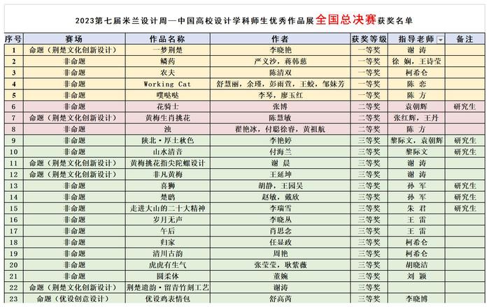 本网讯 2023第七届米兰设计周中国高校设计学科师生优秀作品展省赛、国赛、优秀作品展等系列活动落下帷幕,我校参赛作品获得全国总决赛国家级奖项23项(其中一等奖5项、二等奖3项、三等奖15项),湖北省赛区省级奖项82项(其中一等奖12项、二等奖22项、三等奖48项),实现了该项赛事上获奖数量和获奖质量双突破。因赛事组织工作表现突出,学校荣获优秀组织单位奖。