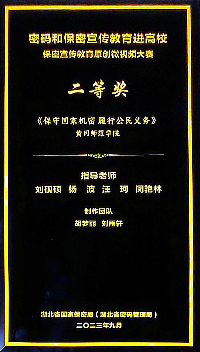 本网讯 近日,由湖北省国家保密局、湖北省密码管理局主办的保密宣传教育原创微视频大赛结果揭晓,由新闻与传播学院创作并由学校遴选推荐上报的《保守国家机密 履行公民义务》荣获二等奖。据悉,此次比赛全省共评一等奖3名、二等奖6名、三等奖9名。