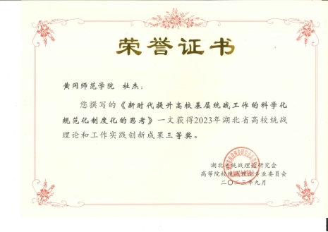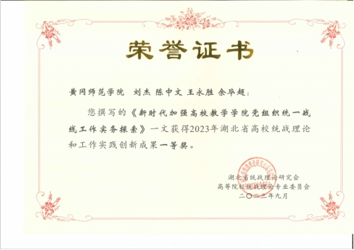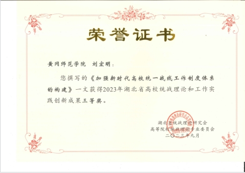 近日,湖北省高校统战理论研究会第38次年会在孝感召开,对2022年全省高校统战理论和工作实践创新成果进行表彰。我校刘杰牵头撰写的《新时代加强高校教学学院党组织统一战线工作实务探索》荣获优秀论文一等奖,刘宏明的《加强新时代高校统一战线工作制度体系的构建》、杜杰的《新时代提升高校基层统战工作的科学化规范化制度化的思考》荣获优秀论文三等奖,钟劲松的《百年统战历史的五点启示》获优秀奖。我校在年会上作典型交流发言。