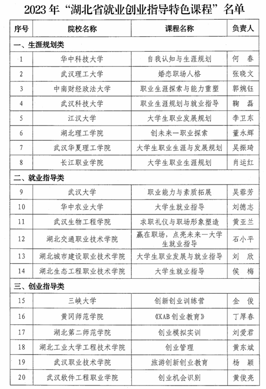 本网讯 近日,湖北省教育厅公布了2023年湖北省就业创业特色课程名单,我校商学院教师丁厚春及其教学团队申报的《KAB创业教育(Know About Business)》课程成功入围。