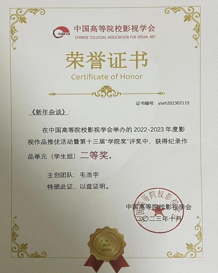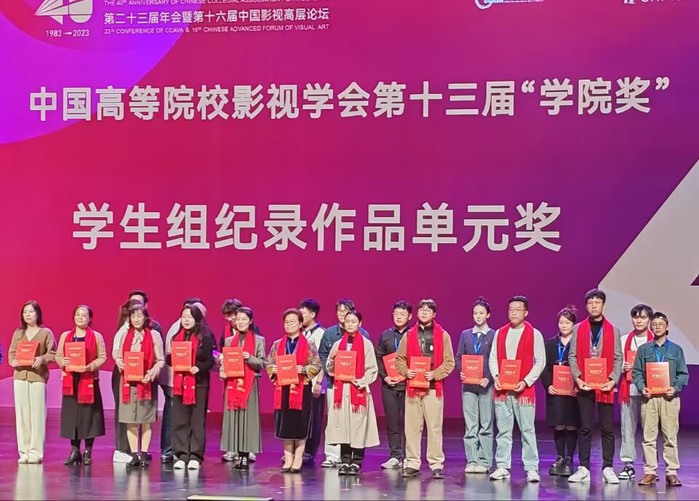 本网讯 近日,中国高等院校影视学会成立40周年纪念大会、第二十三届年会暨第十六届中国影视高层论坛在北京电影学院召开。会议期间,在北京电影学院的千人剧场,举办了2022-2023年度学术成果、影视作品推优活动暨第十六届“学会奖”、第十三届“学院奖”颁奖典礼。由我校新闻与传播学院推荐、编导2002班毛浩宇同学导演的纪录片《新年杂谈》(After going home)荣获学院奖纪录片单元(学生组)二等奖。