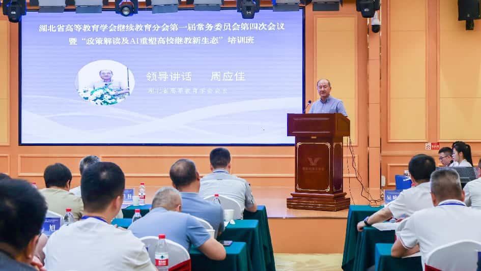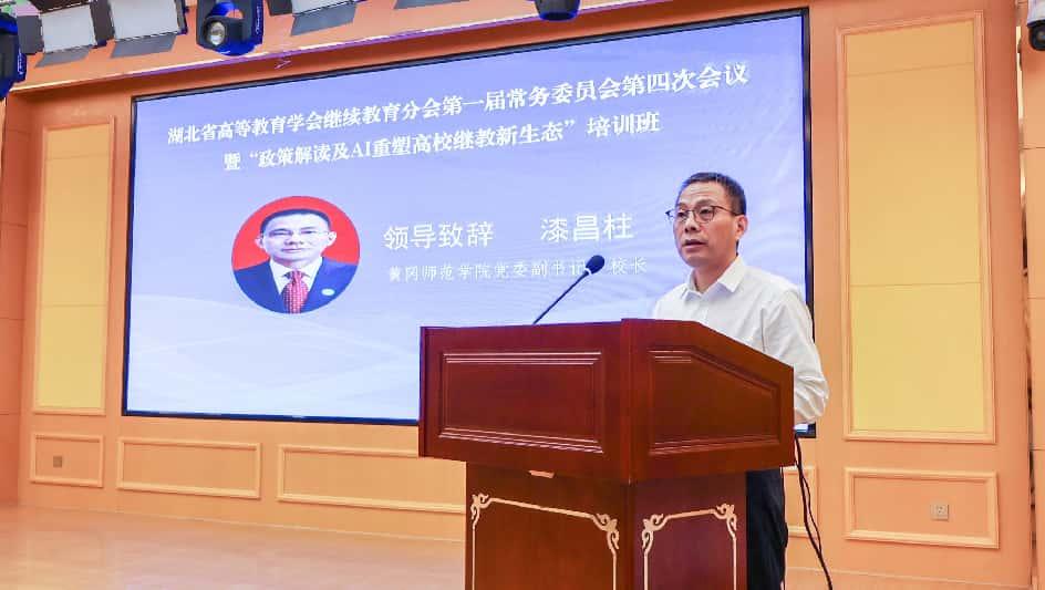 本网讯 5月21日至23日,湖北省高等教育学会继续教育分会第一届常务委员会第四次会议暨“政策解读及AI重塑高校继续教育新生态”培训班在黄州成功举办。我校党委副书记、校长漆昌柱, 湖北省高等教育学会会长周应佳,湖北省高等教育学会继续教育分会副理事长、秘书长吴咏梅,副理事长张治武、李静等出席会议。