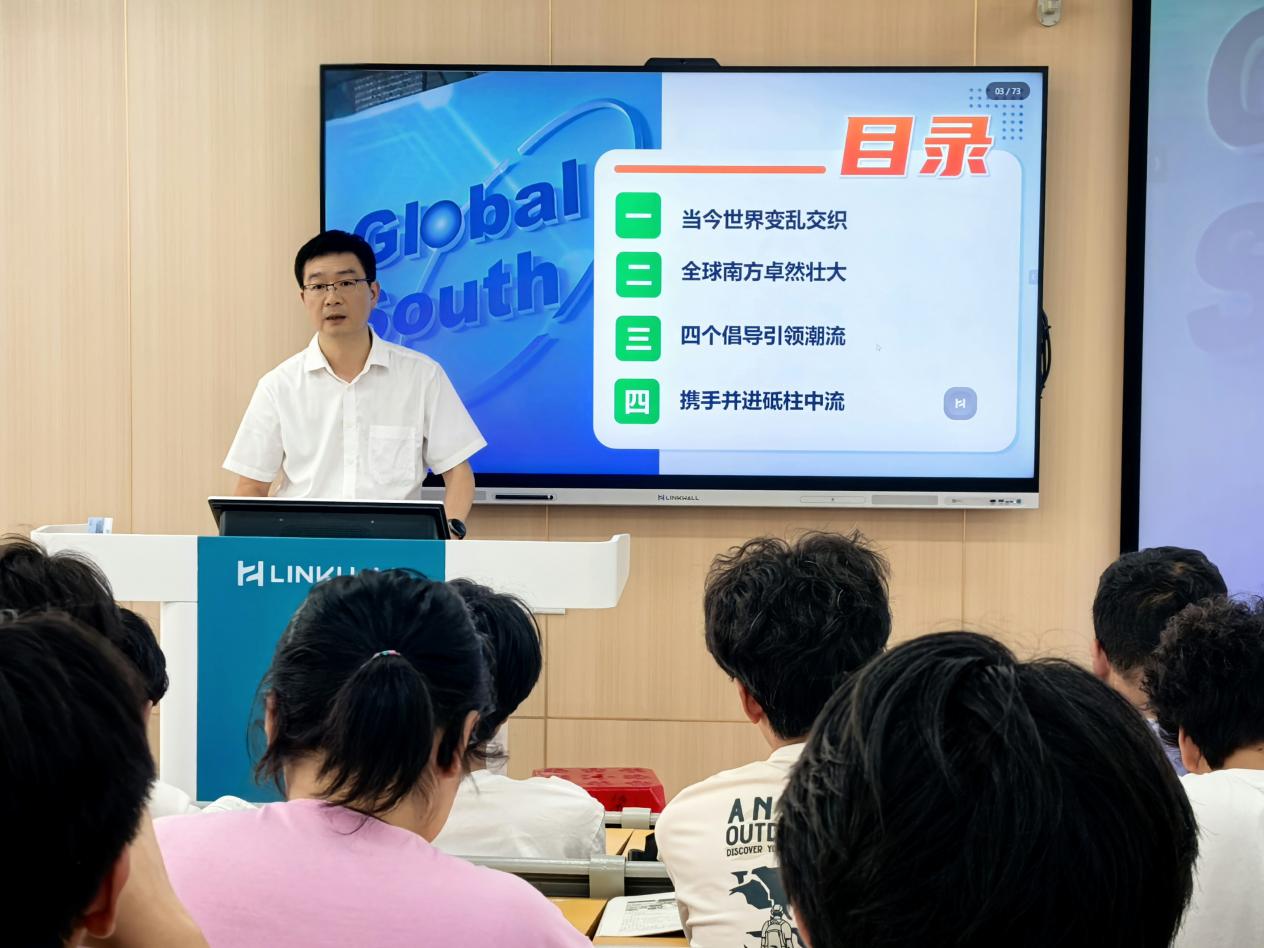 5月28日下午,校党委副书记陈朝阳以《谱写全球南方团结合作新篇章》为题,为建筑工程学院造价、智能建造2024级学生讲授思政课。